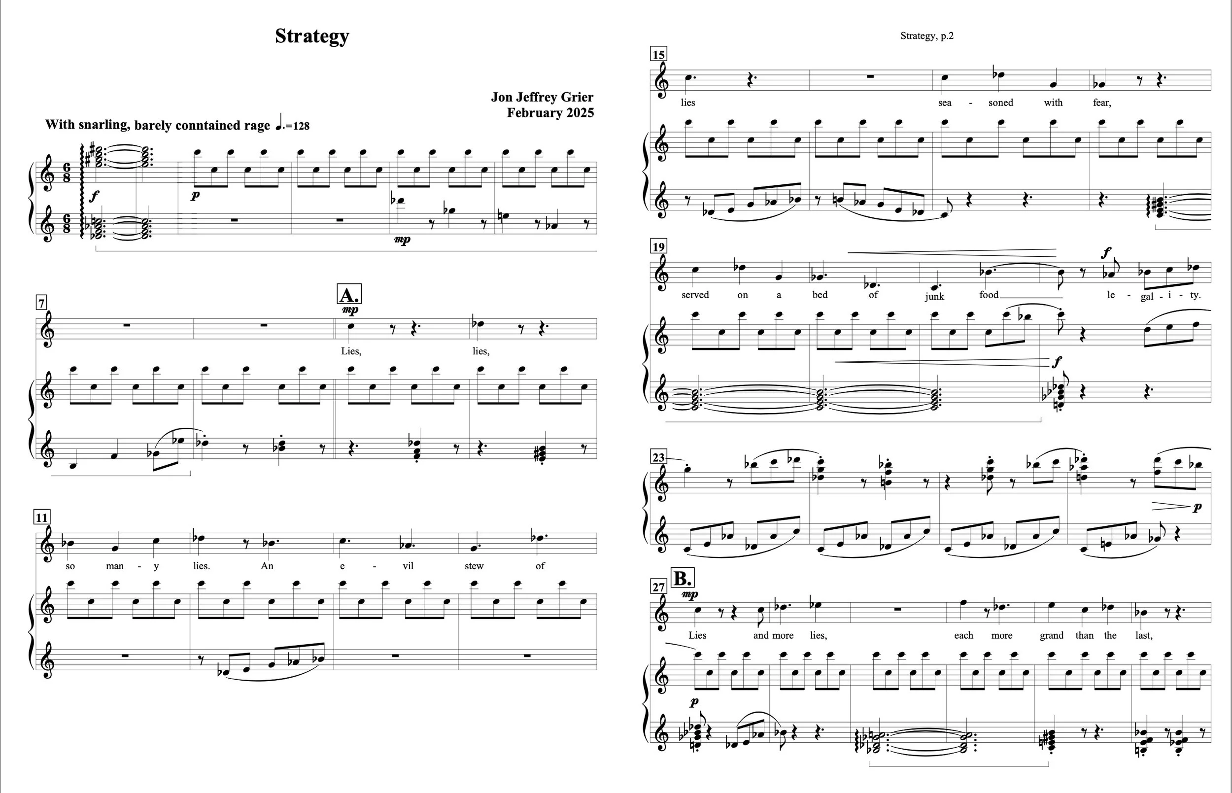 For female voice, about 2:45, range Db4-G5. The text is my own, concerned with the unprecedented, relentless flood of lies spewing from the Trump Administration and the dangerous temptation to allow numbness to set in. $5 for score and demo; order here.